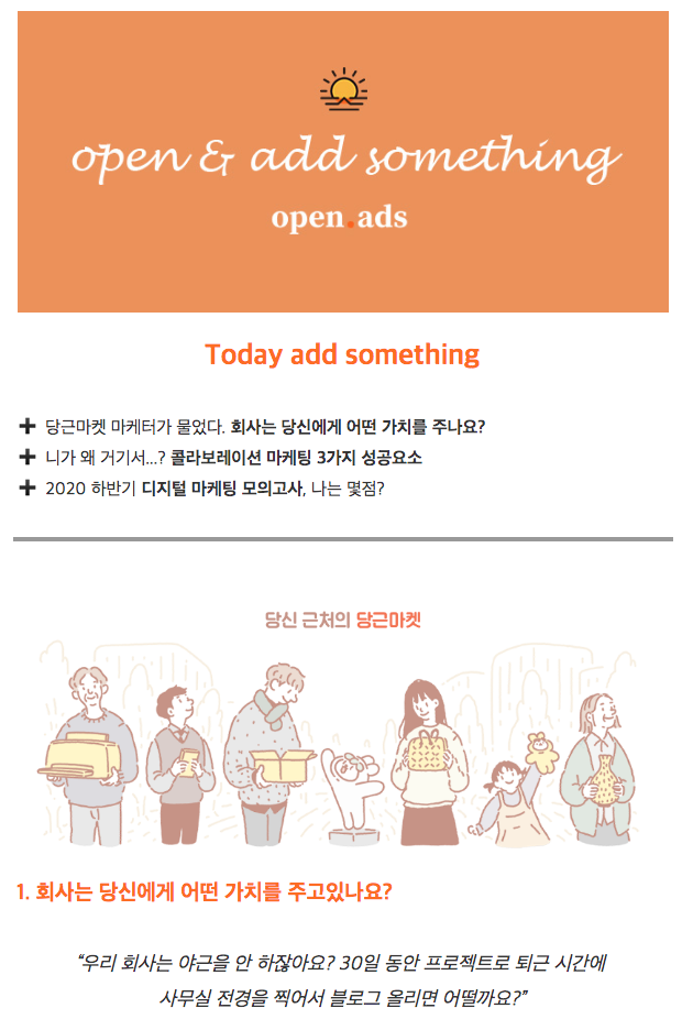 마케팅에 대한 다양한 정보를 큐레이팅하여 보내주는 오픈애즈 뉴스레터! '마케터를 위한, 마케터가 될 수 있는 누구나를 위한 큐레이션 플랫폼'이라는 오픈애즈의 캐치프레이즈에 맞게 폭넓은 정보를 다루는데요. 마케팅에 대한 핫한 정보와 트렌드를 읽고 싶은데 여러 가지를 구독하기에 조금 부담되는 분들에게 딱 맞는 뉴스레터입니다. 오픈애즈 뉴스레터의 특징은 특히 MZ세대가 흥미 있어할 만한 주제를 맛깔나고 이해하기 쉬운 문장으로 설명해주기 때문에 SNS를 보듯 편안하게 볼 수 있다는 점인데요. 그래서 저도 다른 뉴스레터보다도 자주 클릭하게 되고 열어보게 되더라구요.