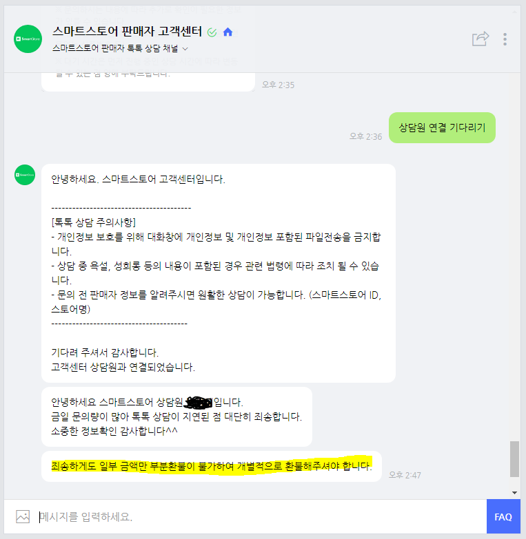 기다린 끝에 상담원에게 '죄송하게도 일부 금액만 부분 환불이 불가하여 개별적으로 환불해주셔야 합니다.' 라는 답변을 받았습니다.